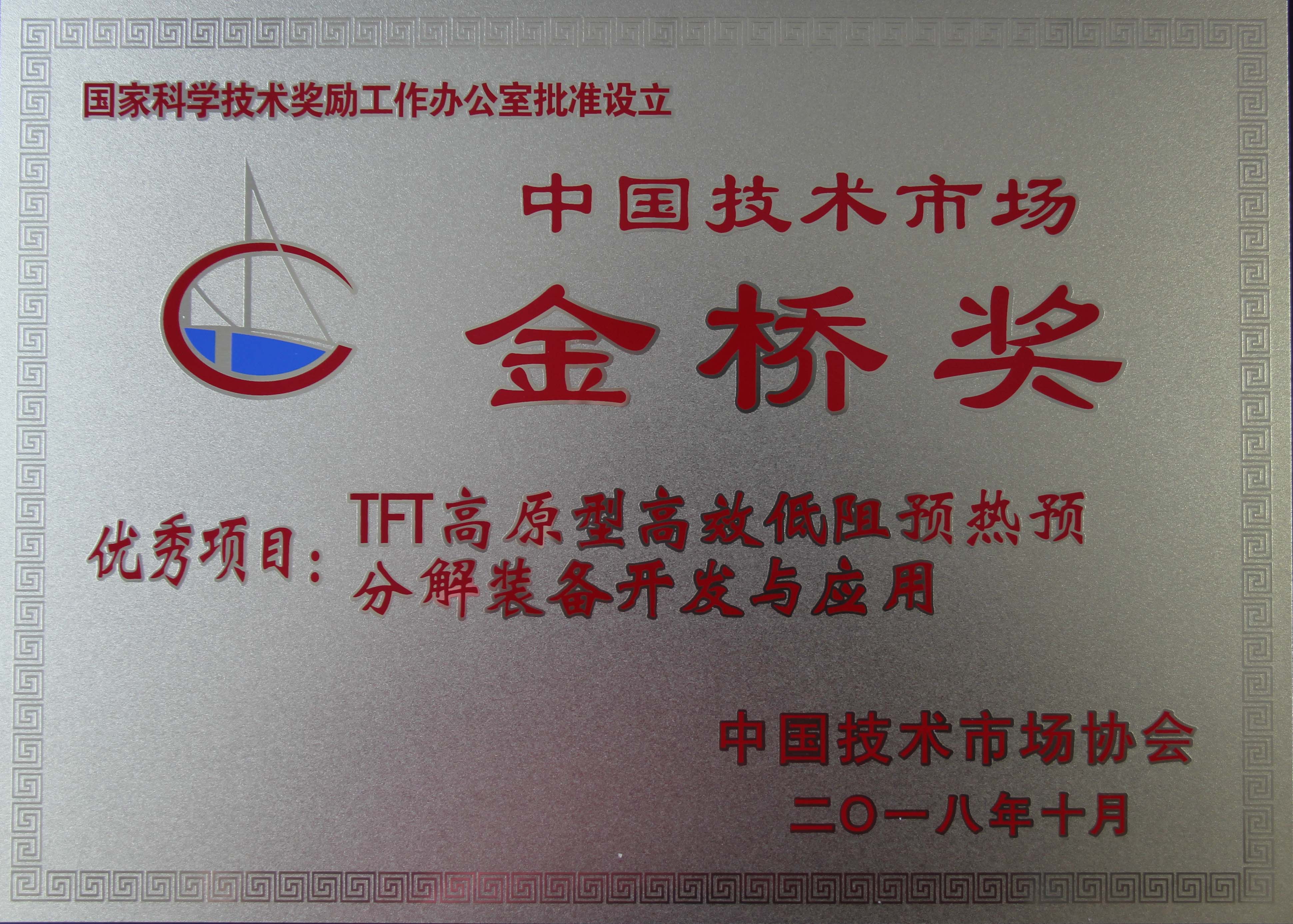 第九屆中國技術(shù)市場協(xié)會金橋獎頒獎大會于2018年10月31日在北京召開,我公司繼上屆榮獲先進(jìn)集體獎后,今年申報的“TFT高原型高效低阻預(yù)熱預(yù)分解裝備開發(fā)與應(yīng)用”項目經(jīng)第九屆中國技術(shù)市場協(xié)會金橋獎評審委員會評審,榮獲優(yōu)秀項目獎。