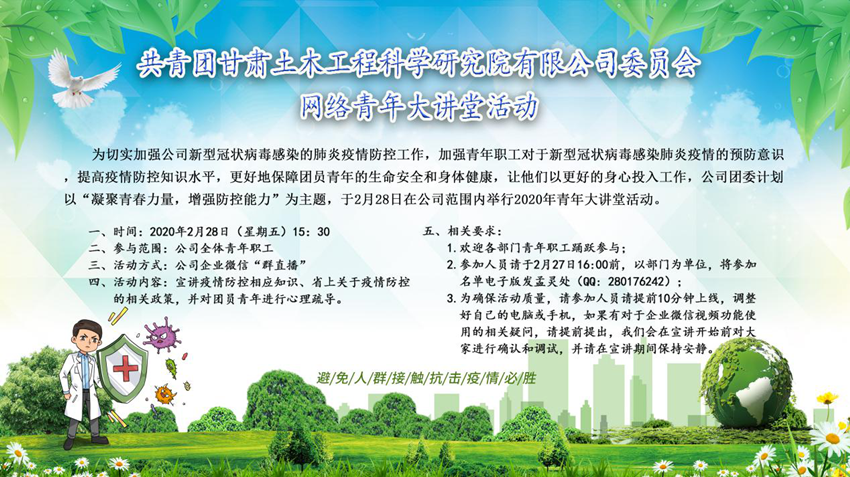 2月28日,公司團(tuán)委主辦的“網(wǎng)絡(luò)青年大講堂” 以在線直播的方式在土木院企業(yè)微信群開(kāi)講,共有近百名青年團(tuán)員收看了直播。