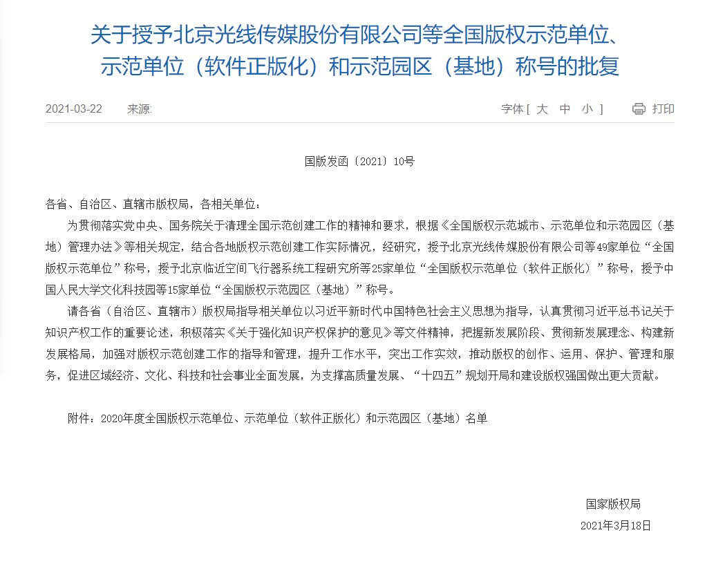 2021年3月18日,國(guó)家版權(quán)局正式發(fā)文授予我公司“2020年度全國(guó)版權(quán)示范單位(軟件正版化)”榮譽(yù)稱號(hào)。全國(guó)有25家單位獲此稱號(hào),我公司是甘肅省唯一一家獲此殊榮的單位。本次榮譽(yù)的授予,是國(guó)家版權(quán)局對(duì)認(rèn)真貫徹《國(guó)家知識(shí)產(chǎn)權(quán)戰(zhàn)略綱要》,深入實(shí)施創(chuàng)新驅(qū)動(dòng)發(fā)展戰(zhàn)略,強(qiáng)化知識(shí)產(chǎn)權(quán)創(chuàng)造、運(yùn)用、保護(hù)和管理先進(jìn)單位的表彰;更是對(duì)我公司全體職工在軟件正版化方面工作的肯定。