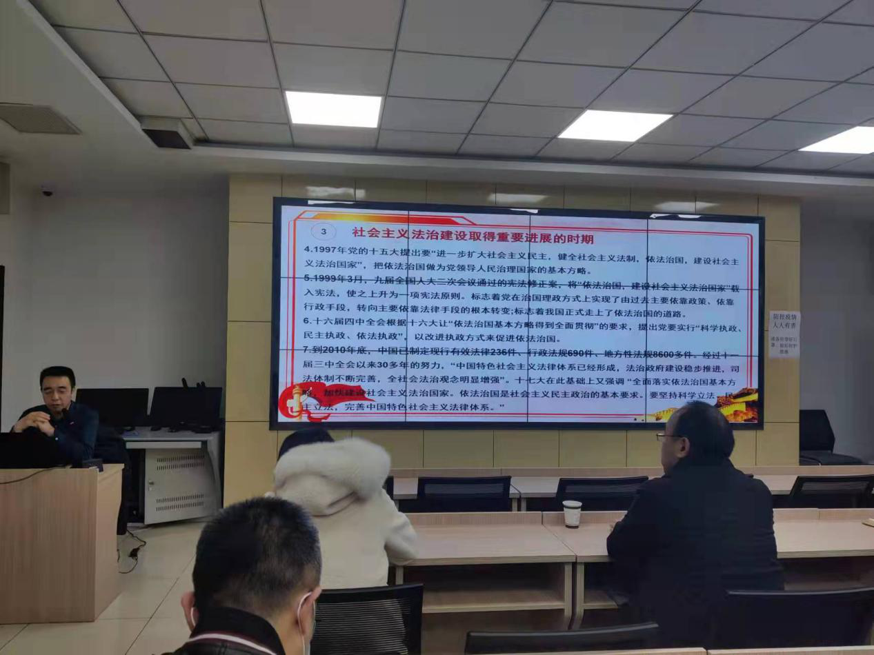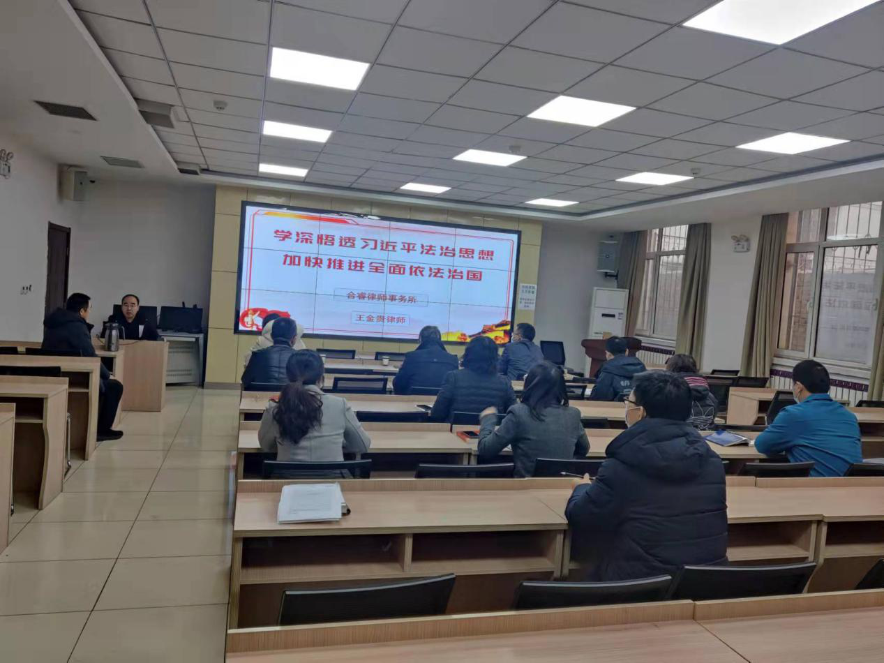 會議邀請了合睿律師事務(wù)所王金貴律師作《學深悟透習近平法治思想》的專題輔導(dǎo)講授。王金貴律師以依法治國探索的開端為切入點,以黨的法治建設(shè)歷史為主線,結(jié)合自身的切身體會,深入淺出的對習近平法治思想的形成作了全面深入的解讀,習近平法治思想從歷史和現(xiàn)實貫通、國內(nèi)和國際關(guān)聯(lián)、理論和實踐相結(jié)合上,深刻回答了新時代為什么實行全面依法治國、怎樣實行全面依法治國等一系列重大問題。