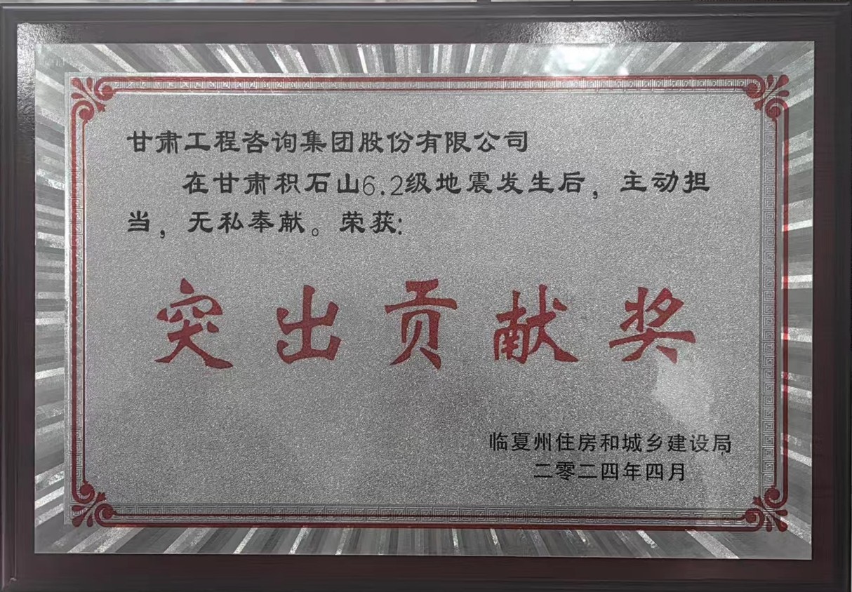 在甘肅積石山6.2級地震后,甘肅工程咨詢集團主動擔當,無私奉獻,在應急救援、災后重建工作中表現(xiàn)突出,被臨夏州住房和城鄉(xiāng)建設局授予“突出貢獻獎”。