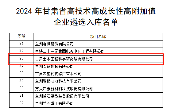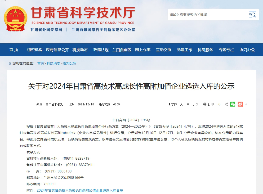 近日,甘肅省科技廳發(fā)布《關(guān)于對2024年甘肅省高技術(shù)高成長性高附加值企業(yè)遴選入庫的公示》,我公司成功入選甘肅省高技術(shù)高成長性高附加值(簡稱“三高”)企業(yè)名單。