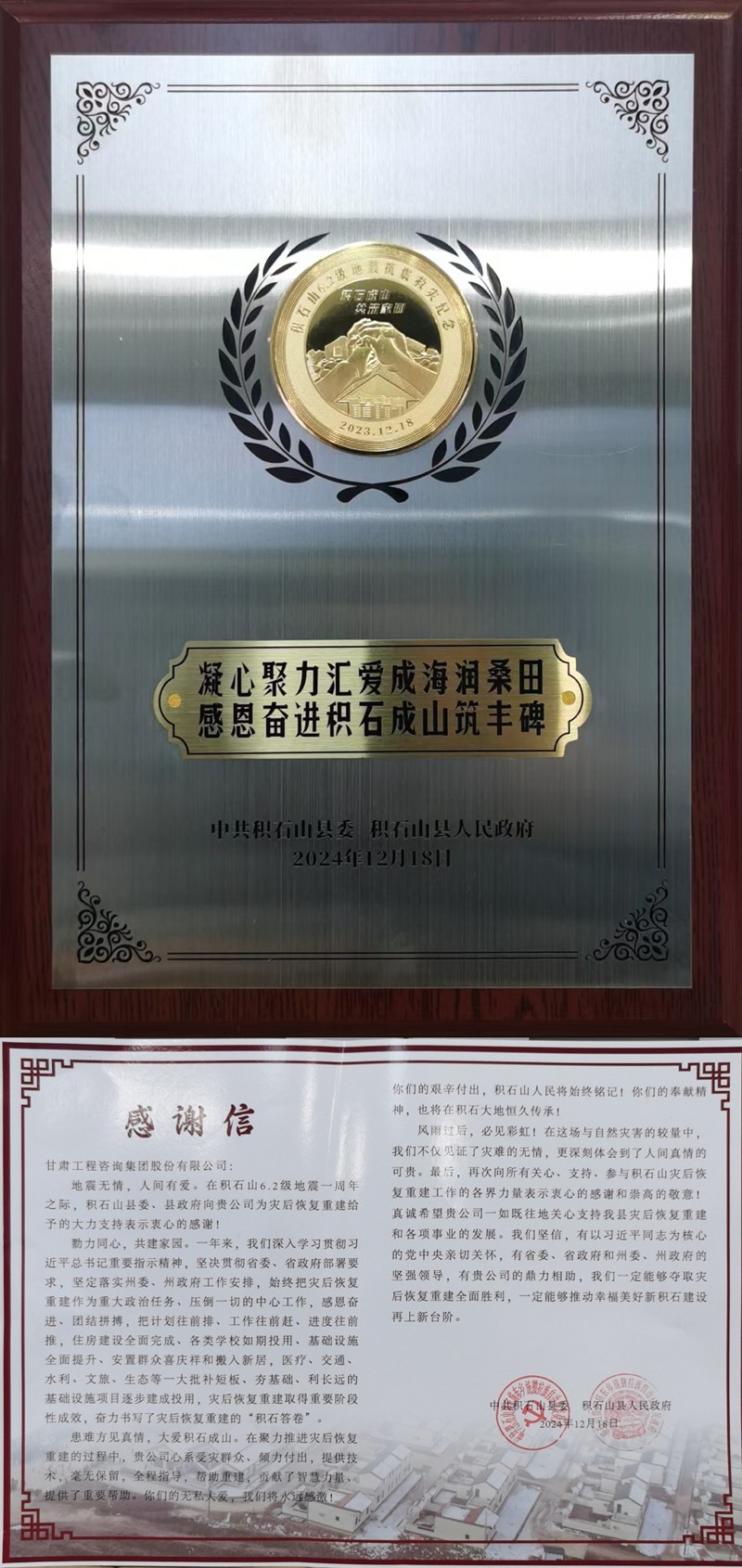 1月22日,時(shí)值北方農(nóng)歷小年。中共積石山縣委、積石山縣人民政府為甘肅工程咨詢集團(tuán)送來感謝信,對(duì)甘肅工程咨詢集團(tuán)在災(zāi)后恢復(fù)重建給予的大力支持表示感謝,并致以節(jié)日問候。