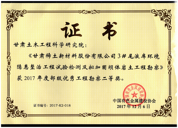 1.獲2017中國(guó)有色金屬建設(shè)協(xié)會(huì)部級(jí)優(yōu)秀工程勘察二等獎(jiǎng);