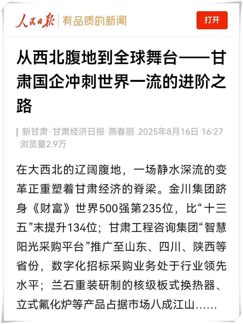 在大西北的遼闊腹地,一場靜水深流的變革正重塑著甘肅經(jīng)濟(jì)的脊梁。金川集團(tuán)躋身《財富》世界500強(qiáng)第235位,比“十三五”末提升134位;甘肅工程咨詢集團(tuán)“智慧陽光采購平臺”推廣至山東、四川、陜西等省份,數(shù)字化招標(biāo)采購業(yè)務(wù)處于行業(yè)領(lǐng)先水平;蘭石重裝研制的核級板式換熱器、立式氟化爐等產(chǎn)品占據(jù)市場八成江山……